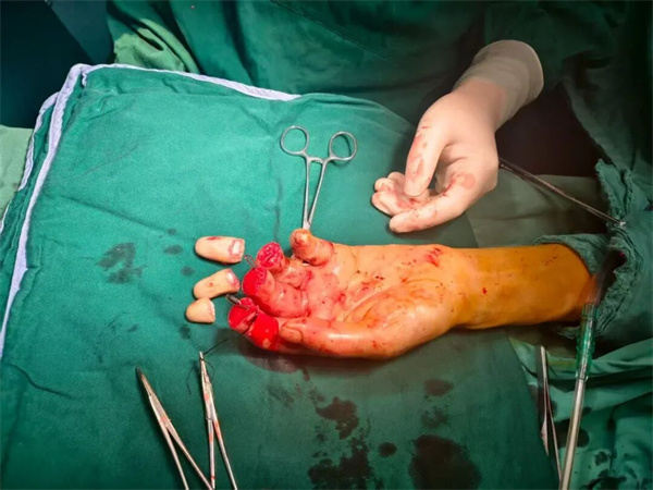 "患者左手食指、中指和无名指末节完全断离。"谢长翔回忆道,"我们立即采取压迫止血、建立静脉通道、镇痛等急救措施,同时严格按照外科诊疗要求对离断指体进行处理,并快速完成术前检查,为再植手术争取宝贵的黄金救治时间。"