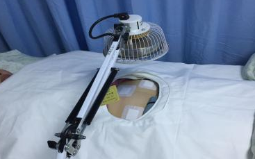 妇科腹部手术后常规采用TDP电磁波治疗仪进行伤口理疗,以起到消炎、 止痛、 消肿、 促进新陈代谢和上皮生长, 增强细胞的活力, 加速伤口愈合的作用。但在操作时需要暴露伤口,由于伤口位置在腹部,操作时,盖被只能遮挡住腰部以下,或者从侧面暴露伤口,极易导致患者受凉,尤其是寒冷季节。为改善这种状况,我科自制了小孔被,方便操作且保暖效果好。