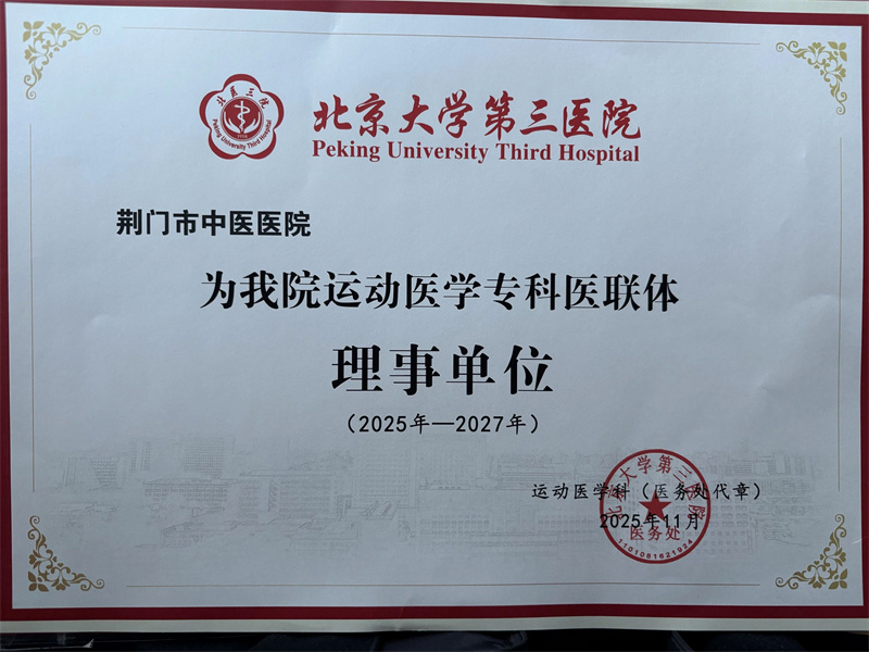近日,北京大学第三医院运动医学专科医联体成立大会在北京顺利召开。会上,荆门市中医医院被正式授予“北京大学第三医院运动医学专科医联体理事单位”,标志着我院在骨科运动医学专业的建设水平获得了国家级权威机构的高度认可。